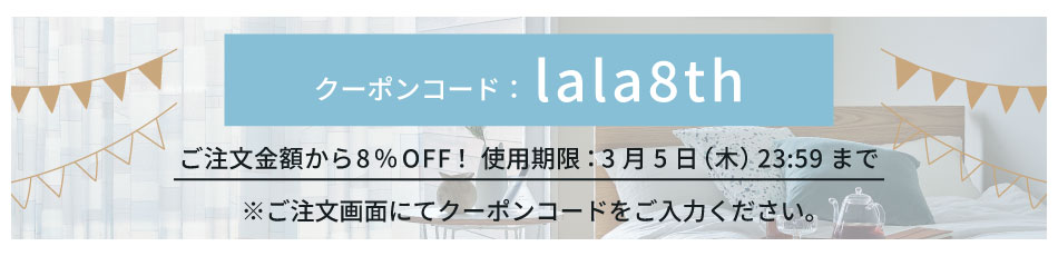 ご注文の際、クーポンコード入力欄に「lala8th」とご入力ください。